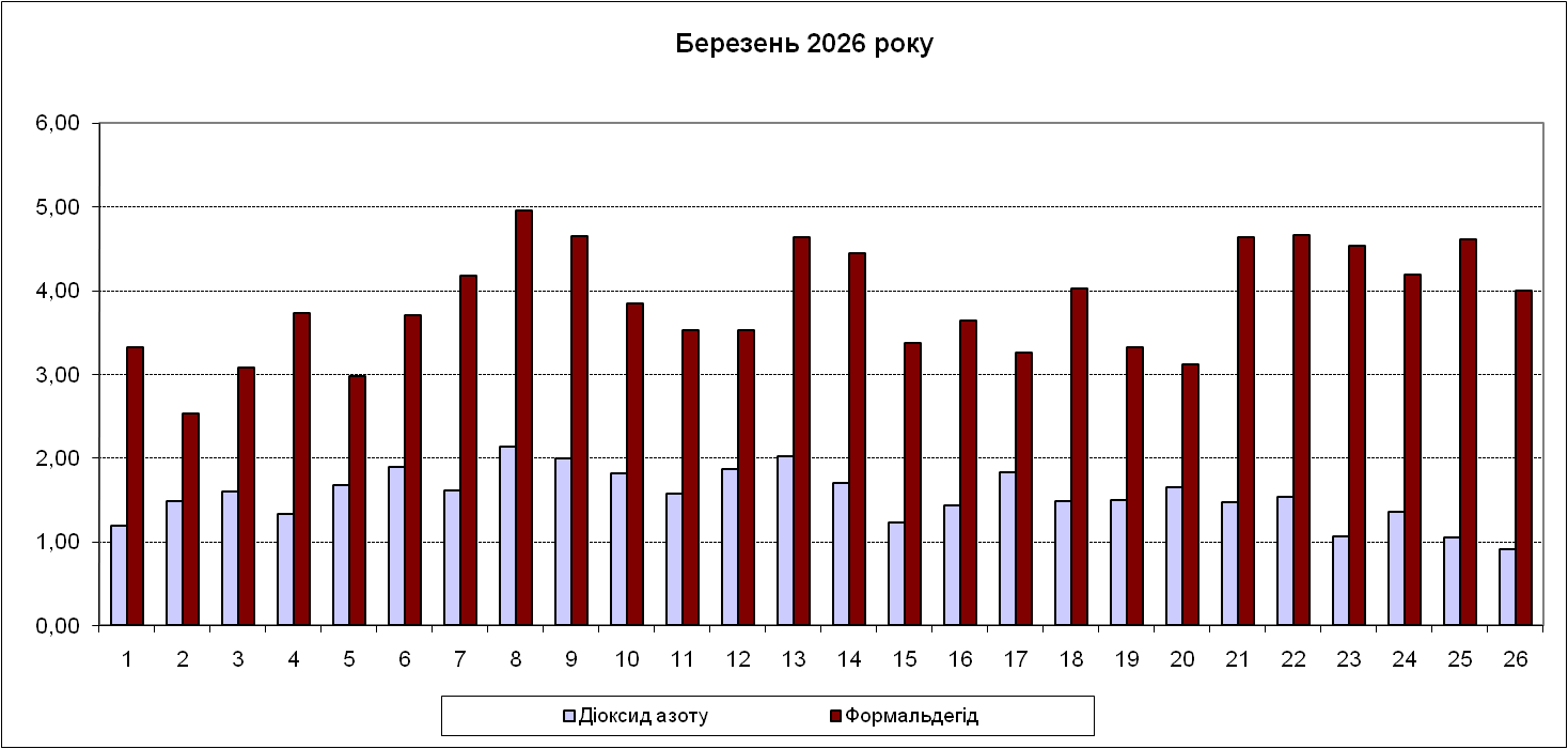 Порівняно з березнем 2025 року, спостерігається ріст середньомісячної концентрації діоксиду та оксиду азоту, оксиду вуглецю, розчинних сульфатів та формальдегіду; вміст діоксиду сірки та пилу нижчий торішнього.