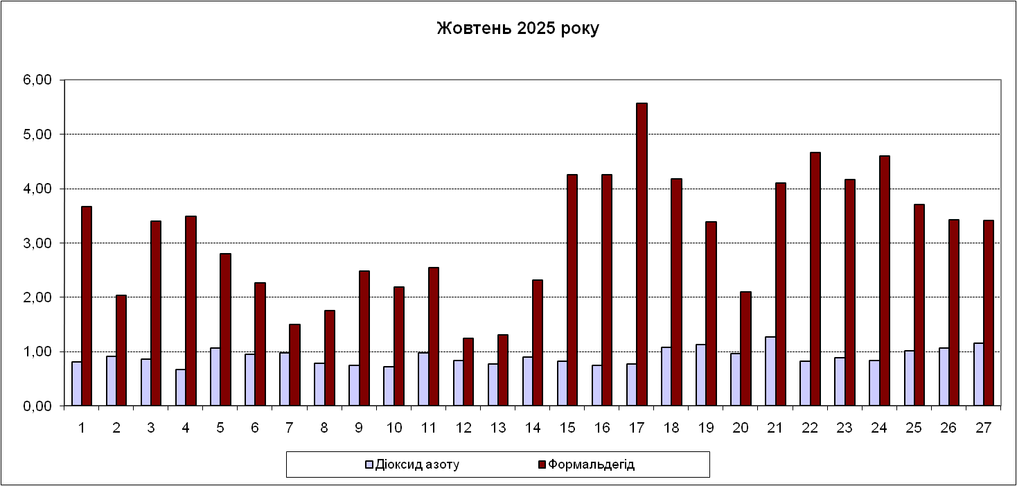 Порівняно з жовтнем 2024 року, спостерігається ріст середньомісячної концентрації формальдегіду; концентрація розчинних сульфатів — на торішньому рівні, вміст решти забруднювачів менший торішнього.